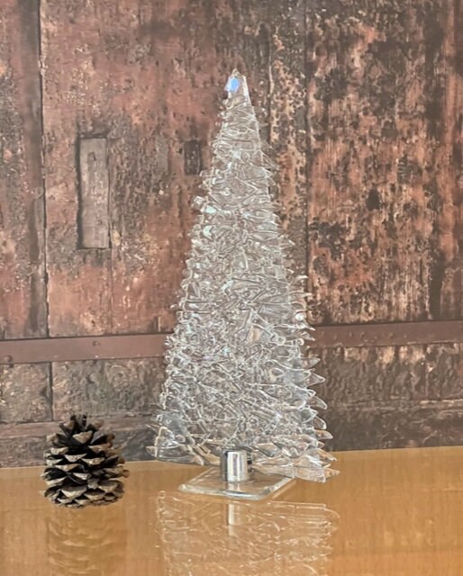 This stunning fused glass ice tree would be beautiful on a window sill reflecting light through it, or on a shelf or table. It stands 8.5" tall in a unique glass and metal stand. It has sparkly iridescent glass pieces scattered throughout adding extra shimmer.